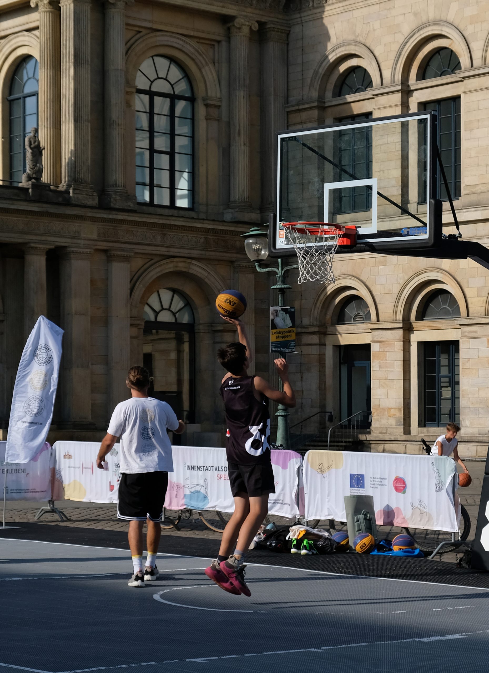 Würfe versenken Freizeitsport: Spiel am 3×3-Basketball-Court auf dem Opernplatz während der „Bewegungs(T)räume Innenstadt“ 2022